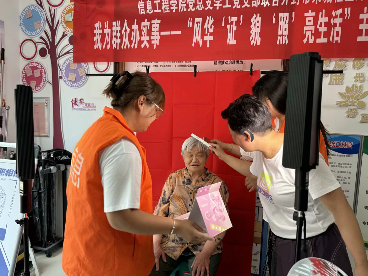 活动现场,信息工程学院的党员们布置好临时摄影场地,准备好专业摄影设备、背景布、灯光等器材。随着居民的陆续到来,党员们热情地迎上前去,耐心询问需求,帮助他们整理衣服、梳理头发,以专业的摄影技术和贴心的服务,为居民拍摄证件照。