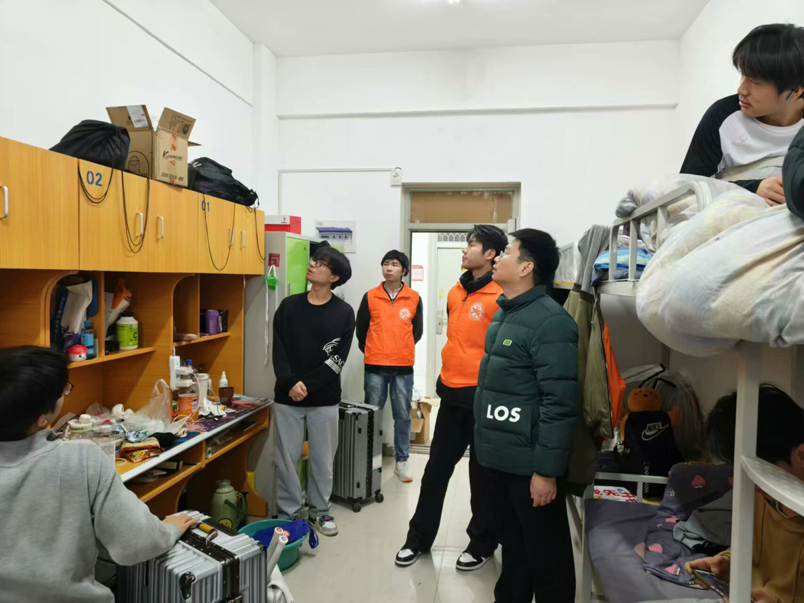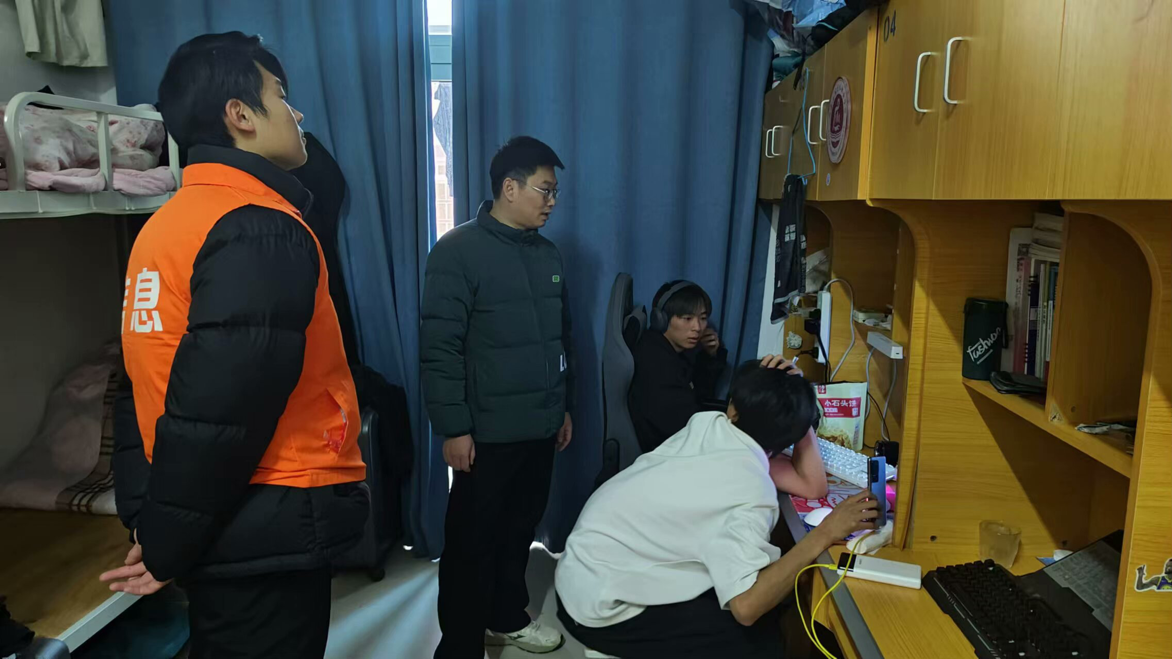 为切实做好假期宿舍安全工作,着力消除安全隐患,共筑平安校园,信息工程学院副院长齐峰、副书记蒋欣哲带领辅导员们深入学生宿舍关注学生诉求,提醒学生归家时注意乘车安全、财产安全;要求其在离校前做好宿舍内的断电、关窗、落锁等工作,并耐心复查验收离校学生宿舍。