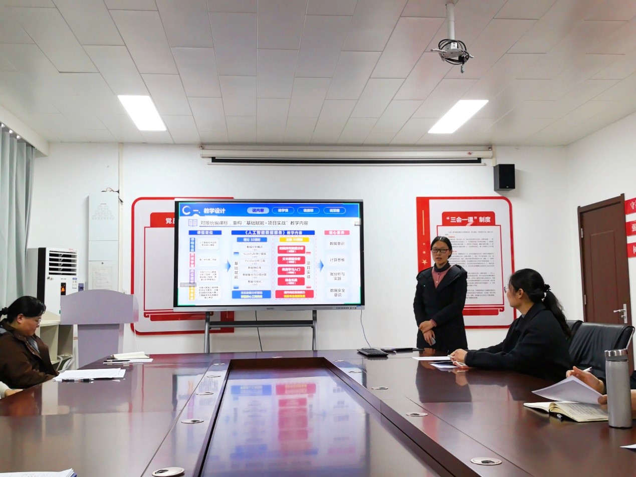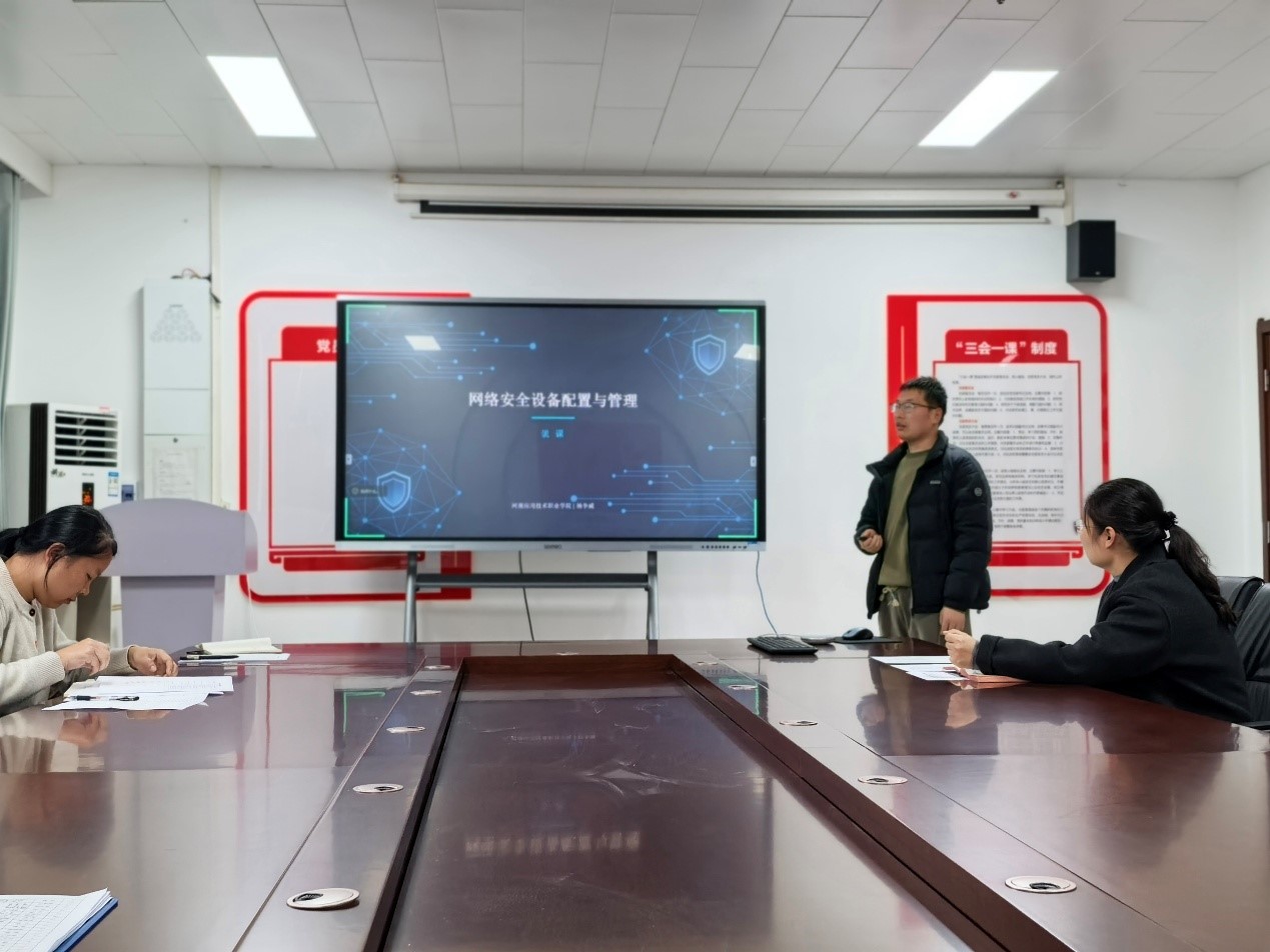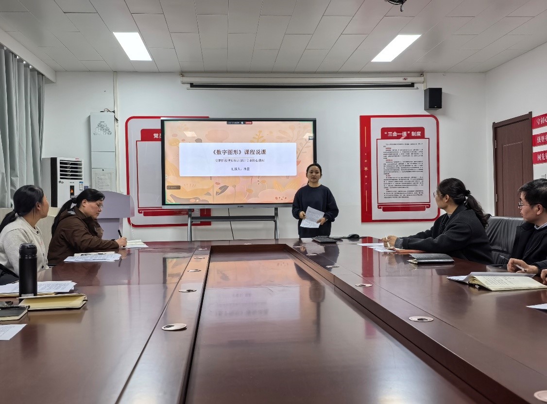 “说课程”环节同样精彩纷呈,七位教师围绕六大维度展开深入阐述:米楠老师在《三维动画制作》中通过项目驱动教学提升学生创作能力;孙星老师针对《数字图形》分享了模块化内容体系与混合式教学模式;谢妞妞老师在《数据库技术及应用》中运用虚拟仿真与案例教学法强化实操能力;吴华芹老师围绕《Java程序设计》以“讲练结合、赛教融合”重构课程内容;刁燕鹏老师在《通信工程制图》中对接行业标准开展工程实践训练;雷惠芳老师针对《人工智能数据服务》采用任务驱动式教学覆盖数据全流程处理;杨争威老师则围绕《网络安全设备配置与管理》通过实战演练培养学生解决实际问题的能力。每位教师的汇报均紧密结合人才培养需求,充分体现了课程建设对技术技能人才培养的支撑作用,并在随后的交流答辩环节中与参会教师展开了深入探讨。